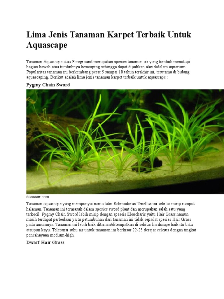 Pertumbuhannya yang menyebar membuat tanaman ini cocok di jadikan salah satu tanaman karpet aquascape. Dari ratusan jenis tanaman yang bisa dijadikan penghias aquascape, sepuluh berikut ini adalah yang paling mudah didapat dan dirawat dengan harga yang relatif murah. Keberadaannya sebagai parasite tentu akan mengganggu pertumbuhan dari tanaman aquascape anda, termasuk jenis tanaman karpet aquascape tanpa co2. Dilansir dari berbagai sumber, berikut tujuh jenis tanaman yang bisa digunakan sebagai dekorasi di dalam akuarium:: Secara sederhana, aquascaping adalah berkebun di dalam air.